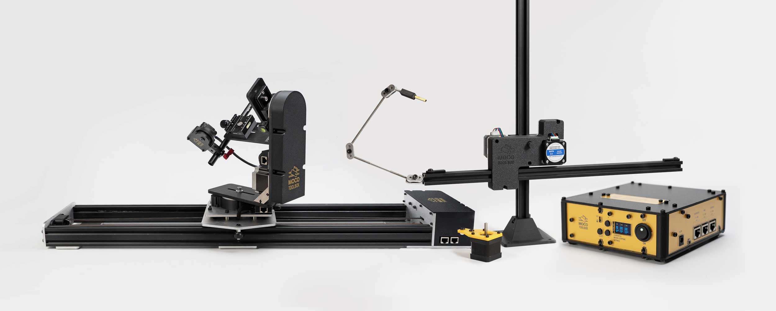 Moco Toolbox DFMoco controller is a powered controller based on Dragonframe Arduino sketch. It can drive up to 4 stepper motors silently with high precision. It’s easy-to-use design lets you setup and configure motorized rigs easily on your stop motion set.